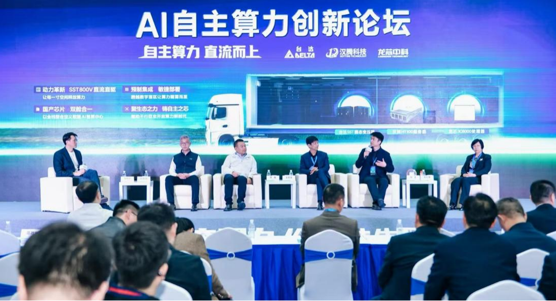 右至左:石家庄双鸽食品有限责任公司董事长、党委书记高秋菊,龙芯中科副总裁张戈,汉腾科技董事长王皓霆,台达-中达电通资通讯基础设施事业部解决方案部总监李南,太初元碁商务副总裁陈晓泉五位行业领军嘉宾,和到场嘉宾们共同探讨AI算力基础设施的未来发展与生态共建。