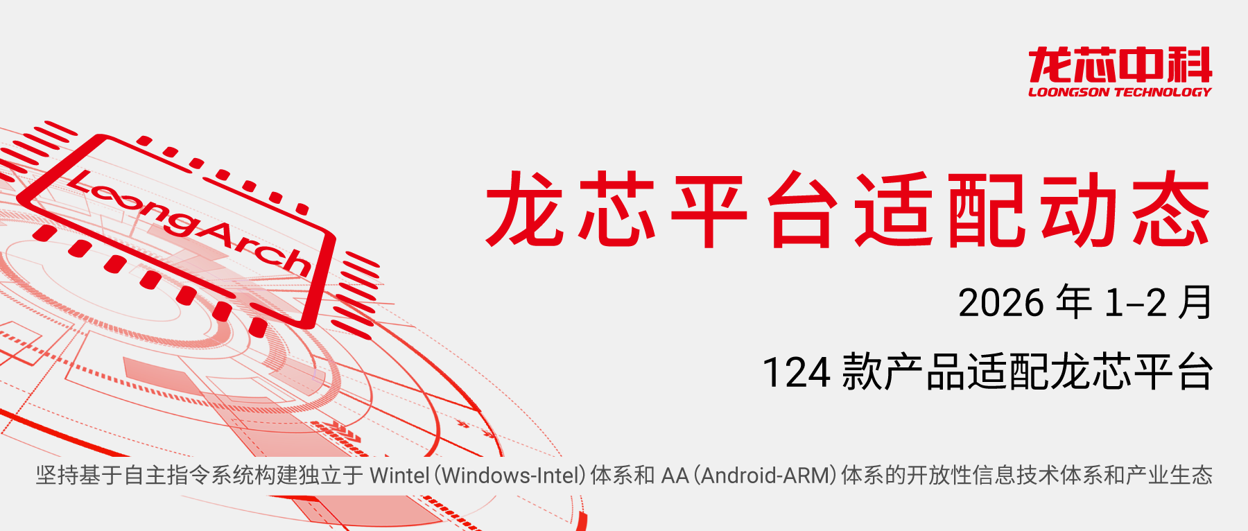 龙芯中科以龙架构(LoongArch)为核心,持续深耕自主信息技术产业生态建设。2026年开年首季,龙芯平台1-2月新增适配产品124款,64家生态伙伴携手攻坚,实现了从基础软硬件到行业专用方案、从桌面终端到服务器端的全维度拓展,为各行业数字化转型与自主可控建设筑牢技术底座。 生态的繁荣,源于伙伴的同行。本次124款适配产品的落地,是龙芯与生态伙伴协同创新的成果。龙芯始终坚持开放共生、生态共赢的理念,通过开放龙架构技术文档、提供全流程适配工具与技术支持、开展联合调试攻关,为伙伴搭建起高效的创新平台。 2026年1-2月LoongArch新增适配列表 * 以下为部分展示 公司/组织名称 产品名称 芯片型号 广州市品高软件股份有限公司 品高聆客即时通讯软件(BingoLink)V5.3.2 3A5000/3A6000/3B600M 广州市品高软件股份有限公司 品高聆客协同管理平台(BingoLink)V5.3.2 3A5000/3A6000/3B600M 万兴科技集团股份有限公司 万兴脑图思维导图设计软件V13 3A5000/3A6000 万兴科技集团股份有限公司 万兴图示设计软件V15 3A5000/3A6000 万兴科技集团股份有限公司 万兴项目管理软件V3 3A5000/3A6000 重庆中联信息产业有限责任公司 中联专业版住院医生工作站系统(简称:ZLINDS)V2.0 3C5000/3C5000L/3D5000 北京百度网讯科技有限公司 百度Linux服务器操作系统 V5.0 3C5000/3C5000L/3C6000 奇安信网神信息技术(北京)股份有限公司 奇安信网神安全访问控制网关ZTNA V5.0 3A5000/3A6000 深圳十沣科技有限公司 TF-eMag电磁仿真软件 V2024 3A5000/3A6000 中电科金仓(北京)科技股份有限公司 金仓数据库管理系统 KingbaseES V8 3B6000M 郑州航空港区政务服务和大数据中心 港政办2.3.7 3A5000/3A6000 信安(天津)网络安全科技有限公司 国际商贸物流大模型教学实验实训系统V1.0 3C5000/3C5000L/3D5000/3B6000/3C6000 沐坤科技有限公司 C30教育云未来教室应用系统(普教版)V2.0 3A5000/3A6000 北京北信源软件股份有限公司 北信源主机安全检测响应系统V3.0 3B5000/3C5000/3C5000L/3D5000 北京北信源软件股份有限公司 北信源主机安全检测响应系统V3.0 3A5000/3A6000 芯展速智能科技(北京)有限公司 芯展速NVMe SSD PT150 系列 3C5000/3D5000 深圳市德明利技术股份有限公司 TWSC EP2021 PCIe4.0x4 M.2 2280 SSD 3A6000 深圳市德明利技术股份有限公司 TWSC ES1020 SATA III M.2 2280 SSD 3A6000 深圳市德明利技术股份有限公司 TWSC DS1420 SATA III 2.5 inch SSD 3A6000 广州泊川软件技术有限公司 国创群世操作系统 QsemOS V1.0 2K1000LA/3C5000/3D5000 新华三技术有限公司 H3C磐宁操作系统 NingOS V3.0 3C5000/3C6000 合肥量盈安全科技有限公司 量子安全服务平台V1.0 3C5000/3D5000/3B6000/3C6000 河北素数信息安全有限公司 量子密钥服务系统V1.0 3C5000/3D5000/3B6000/3C6000 杭州果汁数据科技有限公司 JuiceFS 社区版 3C5000/3C5000L/3D5000/3C6000 航天壹进制(江苏)信息科技有限公司 黑方容灾备份与恢复系统 V6.0 3B6000/3C6000 杭州谐云科技有限公司 谐云HC-DevOps研发运营一体化平台 V4.0 3C5000/3C5000L/3D5000/3B6000/3C6000 云尖(北京)软件有限公司 ieGuard网页防篡改安全系统 V6.0 3A5000/3A6000/3C5000/3C5000L/3D5000 上海智位机器人股份有限公司 Mind+ V1.7.3 3A5000/3A6000 上海英方软件股份有限公司 英方数据备份与恢复管理软件V9(简称:i2Backup V9) 3B6000/3C6000 中电科网络安全科技股份有限公司 橙讯安全即时通讯协作平台 V5.0 3A5000/3A6000 北京融汇画方科技有限公司 画方网络资产可视化管理系统 V1.0 3C5000/3C5000L/3D5000 上海天正软件有限公司 天正影像网页版控件信创支撑软件 V1.0 3A5000/3A6000 厦门市四美达科技发展有限公司 多功能信息采集系统 3A5000/3A6000 广东佳米科技有限公司 消防融合通信 V9.0 3A5000/3A6000 北京微通新成网络科技有限公司 去控件化平台安全组件V1.0 3A5000/3A6000 北京微通新成网络科技有限公司 网银客户端软件(麒麟kylin版)V1.0 3A5000/3A6000 北京微通新成网络科技有限公司 签名信使签名软件(麒麟版)V1.0 3A5000/3A6000 上海云轴信息科技有限公司 ZStack Cloud信创云平台V4 3C5000/3C5000L/3D5000 上海云轴信息科技有限公司 ZStack云计算管理平台V4 3C5000/3C5000L/3D5000 上海云轴信息科技有限公司 ZStack云计算管理平台(虚拟化版)V4 3C5000/3C5000L/3D5000 上海云轴信息科技有限公司 云轴基础架构即服务云管理平台软件 V4 3C5000/3C5000L/3D5000 永中软件股份有限公司 永中Office2024专业版办公软件 V12 3A6000 北京海量数据技术股份有限公司 海量数据库管理系统Vastbase M100 V5.2.1 3A5000/3A5000M/3A6000/3B6000M 北京海量数据技术股份有限公司 海量数据库管理系统Vastbase M100 V5.2.1 3C5000/3C5000L/3D5000/3B6000/3C6000 北京海量数据技术股份有限公司 海量数据库管理系统Vastbase M100 V5.1.0 3A5000/3A5000M/3A6000/3B6000M 北京海量数据技术股份有限公司 海量数据库管理系统Vastbase M100 V5.1.0 3C5000/3C5000L/3D5000/3B6000/3C6000 紫光闪芯科技(成都)有限公司 紫光闪芯消费级SSD产品C1000系列 3A5000/3A6000 紫光闪芯科技(成都)有限公司 紫光闪芯企业级SSD产品E1200系列 3C5000/3C6000 深圳嘉立创科技集团股份有限公司 嘉立创EDA私有部署版V3 3A5000/3A6000 广西顶千楼信息科技有限公司 基层慢病全程精细化管理信息系统V1.0 3A5000/3A6000 广州视臻信息科技有限公司 传屏器WT12A/12/13/15/16 3A5000/3A6000 砺算科技(上海)有限公司 LX 500/700/900系列显卡 3A5000/3A6000/3C5000 砺算科技(上海)有限公司 LX 700系列显卡 3A5000/3A6000/3C5000 砺算科技(上海)有限公司 LX900系列显卡 3A5000/3A6000/3C5000 北京宝兰德