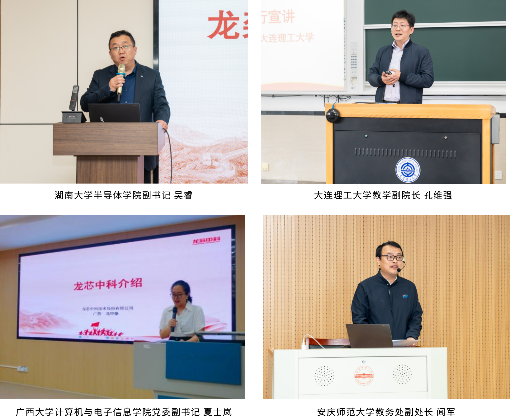 龙芯校园行系列活动得到了各大合作高校的鼎力支持。湖南大学半导体学院副书记吴睿、大连理工大学教学副院长孔维强、广西大学计算机与电子信息学院党委副书记夏士岚、安庆师范大学教务处副处长闻军等高校代表出席活动并作开场致辞,对龙芯中科长期以来支持计算机与集成电路教学科研、推动国产技术进课堂表示感谢,并勉励同学们把握赛事契机,夯实专业基础,积极参与自主信息技术体系建设。