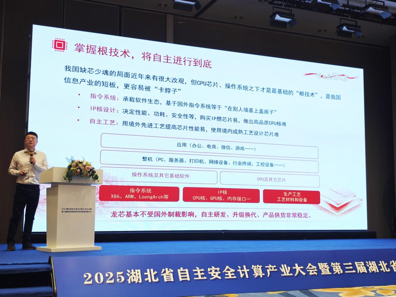 10月17日,2025湖北省自主安全计算产业大会暨第三届湖北省信息技术应用创新发展大会在武汉成功召开。龙芯中科通用事业部副总经理王松宇发表主题演讲。